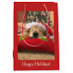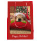 Frohe Weihnachten! Zeigen Sie Ihren Feiertagsgeist mit dieser niedlichen Geschenktasche! Ausrüstungsbeschreibungen eine Fotografie eines Hundes des goldenen Retrievers, der auf einem Kissen unter einem Baum und dem Tragen einer roten Weihnachtsmannmütze schläft. Kundengerechter Text liest, "frohe Feiertage!"