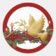 Eine Grafik einer Goldtaube des Friedens, die mit ihren Flügeln nach oben flog, und einen Olivenzweig in ihrem Schnabel trug. Es fliegt über einen zarten, verzierten goldfarbenen Horizontalkwirn, der von winzigen Schneeflocken umgeben ist, und drei roten Kerzen, die hell brennen.