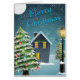 Weihnachtsgrüße mit Bäumen, Schnee, Haus und Straßenlaterne