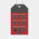 Diese Geschenkmarken haben die Fassade eines roten Stadthauses mit einer Frau, die im Fenster Klavier spielt.