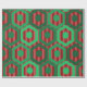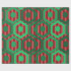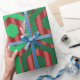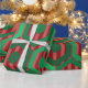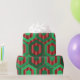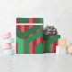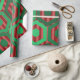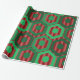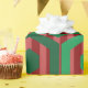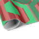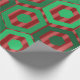 Dieses Verpackungspapier hat ein geometrisches Design von Sechsecken in vier grünen Farbtönen auf einem Feld von Streifen in zwei Farbtönen rot.