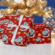 Weihnachtsverpackung mit einer Illustration eines niedlichen glücklichen Hippopotamus mit einem rot-weißen Weihnachtshut; Weihnachtsferien-Design auf rotem Hintergrund mit einer anpassbaren Textvorlage für Ihren Namen oder Ihre Nachricht