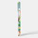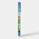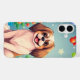 Ein fröhlicher Hund im Stil eines Cartoon mit Diskettenohren und einem großen Lächeln, der vor einem festlichen Hintergrund sitzt. Auf beiden Seiten sind geschmückte Weihnachtsbäume, bunte Ornamente