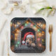 Ein Hundehund mit einer Weihnachtsmannmütze entspannt sich in einem Hundehaus aus Holz, das mit bunten Weihnachtslichtern geschmückt ist