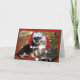 Frohe Weihnachten - Foto eines Welpen und einer Katze, die Weihnachtsmannmützen vor dem Weihnachtsbaum trägt. Fügen Sie dem Text Ihren Namen hinzu oder löschen Sie ihn und schreiben Sie ihn per Hand.