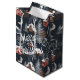 Hütte mit Winterbäumen und halbmondfarbenem Mond auf dunkelgrauem Hintergrund.