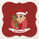 Papier Untersetzer mit einer Illustration eines niedlich lächelnden glücklichen Kleinkindes, trägt er ein rot-weißes Weihnachtskostüm und hält ein Geschenk; mit bearbeitbaren Textvorlagen für Ihren Namen oder Ihre Nachricht, Weihnachtsfeiertagsgestaltung mit rotem Hintergrund