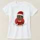 T - Shirt mit einer Illustration eines niedlich lächelnden glücklichen Jungen mit Brille, trägt er ein rot-weißes Weihnachtskostüm und hält ein Geschenk; mit bearbeitbarem Textblatt für Ihren Namen oder Ihre Nachricht, Weihnachtsfeiertagsgestaltung