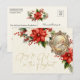 Mit einer wunderschönen und einzigartigen frohen Weihnachtspostkarte mit dem goldenen gerahmten Bild des Jesuskindes in einer Manier mit Akzenten der roten Poinsettien.