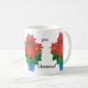 Genießen Sie eine festliche Kuppel in dieser Weihnachts-Ringer-Tasse, mit einem Topf mit leuchtend roten Poinsettien aus einer handbemalten Papiercollage von Judy Adamson. Sie können den Text nach Bedarf personalisieren oder entfernen.