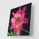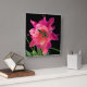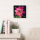 Ein enormes Rotes, lila, zacken möglicherweise sogar aus? Blume birst von einer normalerweise uninteressanten grünen Kaktus-Pflanze. Fotografiert im Makro gegen einen schwarzen Hintergrund, wenn die Uhrmarkierungen im Rosa hinzugefügt sind.