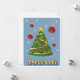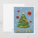 Weihnachtskarte mit einem Baum, Flocken, Weihnachtsbällen und "Fröhliche Weihnachten"