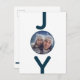 Eine einfache, trendige, minimalistische Weihnachtskarte in Blau und Weiß. Auf der Vorderseite: Ein schick weißer Hintergrund, mit dem Wort JOY mit roten, fetten Buchstaben geschrieben. Der Buchstabe O wird als Foto verwendet. Personalisieren und fügen Sie Ihr eigenes Foto. Zurück: Weißer Hintergrund und blauer Text. Fügen Sie Ihre eigenen Feiertaggrüße und Familiennamen hinzu. Die Buchstaben im Wort JOY als Dekoration.