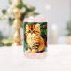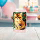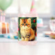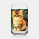 Can Glass mit einer Weihnachtskatze im Jahrgang! Eine orangefarbene Kätzin mit schwarzen Streifen sitzt im Schnee. Hinter der Katze steht ein Weihnachtsbaum mit roten und gelben Ornamenten. Auch auf dem Schnee ist ein rotes Geschenk. Ein perfektes Geschenk für die Weihnachtszeit und Katzenliebhaber!