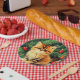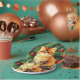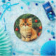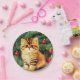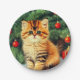 Papier Teller mit einer altmodischen Weihnachtskatze! Eine orangefarbene Kätzin mit schwarzen Streifen sitzt im Schnee. Hinter der Katze steht ein Weihnachtsbaum mit roten und gelben Ornamenten. Auch auf dem Schnee ist ein rotes Geschenk. Ein perfektes Geschenk für die Weihnachtszeit und Katzenliebhaber!