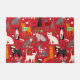 Niedliche Katze, schwarze Katze, Katze, Persikatze, Siamkatze und Tuxedokatze in festlichen Outfits gekleidet, Weihnachtsmannmützen und Raute Pullover mit verstreuten Weihnachtsschmuckstücken.