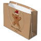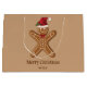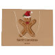 Desteis festliche Illustration eines braunen Farb-Lebkuchen mit einer Weihnachtsmannmütze und einem roten Bogen. Die Hintergrundfarbe ist hellbraun. Es gibt auch zwei personalisierbare Textbereiche.