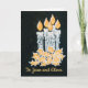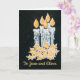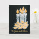 Eine schicke Weihnachtskarte, die sowohl auf der vorderen als auch auf der Innenseite personalisiert werden kann, mit fünf Kerzen mit heiliger, handgemalt in Gold und Silber auf einem schwarzen Hintergrund.