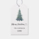 Ein weißer Hintergrund, vlasser Text. Die Einrichtung ist mit einem grünen Kiefernbaum in Aquarelltönen gestaltet. Text: Frohe Weihnachten. Mit einem Herz. Personalisieren und fügen Sie Ihren Familiennamen und das Jahr hinzu. Zurück: kein Design, Platz, an dem Sie per Hand schreiben können.