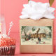 Vintage Abbildung Viktorianisches Weihnachtsbild mit einer schönen Kirche mit Buntglasfenstern bei Sonnenaufgang am Weihnachtsfeiertag. Die Parisonisten gehen im Schnee, um zur Morgendämmerung oder "Schäfermesse" zu gehen
