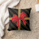 Modernes Feiertags-Kissen; sieht wie ein eingewickeltes Weihnachtsgeschenk aus. Schwarzes Kissen mit den dünnen GoldNadelstreifen, eingewickelt mit einem Goldband und einem Rot/einem Goldbogen. Ein sehr moderner eleganter Zusatz zu Ihrem Feiertagsdekor.