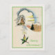 Eine Vintage Postkarte, ein restauriertes und restauriertes antikes zeichn, mit einer brennenden Kerze mit heiligen Blätter, Schnee, einem Haus auf einem Hügel, einem Berg, dem Mond oder der Sonne.