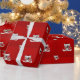 Persönliches Design mit Abbildung niedlicher kleiner Koala Bär mit dem Hut des Weihnachtsmannes, Weihnachtsfeiergestaltung für Kinder, auf rotem Hintergrund; mit anpassbarer Textvorlage