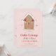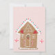Weihnachtsgebäck Austauschen niedliches Ingwer Brot Haus mit handgemalten Haus mit Zuckerrohr, Zuckerrohr, Blumenkranz auf einem essbaren Pastellrosa mit Schnee und einer modernen niedlichen Typografie.