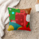 Dieses Kissen hat ein Weihnachtsgeschenk von einer Collage aus einem Weihnachtsbaum, einem Ornament, einem Strumpf, einem Geschenk und einem Lebkuchenjunge.
