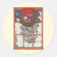 Vintage Illustration Frohe Weihnachts Weihnachtszeit Landschaft Design. Eine Schneeszene mit Blick auf Schneebäume im Wald und ein Haus in der Ferne durch ein 9-Fenster mit einem Kiefernkranz mit einem roten Bogen. Ein architektonisches Element.