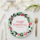 Weihnachtskranz mit grünen Blätter und roten Beeren, moderne Aquarellbilder mit fröhlicher Weihnachtstypografie und anpassbarer Text für einen Familiennamen. Weißer Hintergrund.