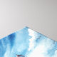 Ein Kranz mit Muscheln und Grünpflanzen schmückt einen Holzzaun, während ein Leuchtturm unter einem Himmel steht, der von dramatischen Wolken und steil ansteigenden Möwen beherrscht wird