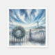 Ein Kranz mit Muscheln und Grünpflanzen schmückt einen Holzzaun, während ein Leuchtturm unter einem Himmel steht, der von dramatischen Wolken und steil ansteigenden Möwen beherrscht wird