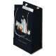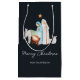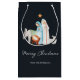 Charmante dunkelblaue Krippe religiöse Weihnachtsgeschenk-Tasche mit einer schönen Aquarellnativität Szene. Ideal, um die Freude der Saison mit den nächsten zu teilen. Die Worte "Frohe Weihnachten" sind elegant unter der Szene geschrieben, die den Zauber und das Wunder von Weihnachten darstellen.