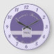 Die Mauer-Uhr der Küche, Chex LILA-ist eine Grafik-Art-Design eines Allover-Chex-Musters. Das Muster ähnelt dem Muster, das man in den Kochbüchern der Großmutter sah. Die Außenseite dieser Uhr ist das lila-weiße Chex-Muster. Die Mitte der Uhr ist eine lila, solide Farbe mit weißem Text. Kursiver Text oben auf der Platte lautet: Großmutter's Küche. Der Text unten lautet: Genießen Sie das Leben. Es ist köstlich! Ein Band mit Tags sitzt unten, um mit einem Initial oder Namen personalisiert zu werden. Die Uhrennummern werden lila gedruckt. Diese Uhr ist in verschiedenen Farben und Texten erhältlich. Informationen zu Melamin-Tellern, die sich koordinieren, finden Sie in meinem zazzle.com/zazzleplates Store.