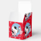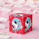 Schwarzweiß gepunktete Kühe mit Weihnachtsmannmützen auf einer roten Kiste mit Schneeflocken. Verwendung für Geschenke von Gastgeschenken.
