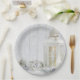 Weiße Weihnachtskerzenleuchte mit Ziergegenständen und Pine im Schnee für eine Feier.