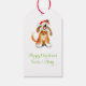 Niedlicher Hundskunst-Geschenktag auf einem hellgrünen Hintergrund. Personalisieren Sie mit Ihren eigenen Worten, Namen oder Nachricht auf der Rückseite liest Happy Holiday. Ideal für Ihre Weihnachtsgeschenke für Hunde- oder Tierliebhaber. Würde auch große Tags für Ihre Haustiere machen. Niedlicher Hund in Aquarellfarbe gemalt und von Sarah Trett entworfen.