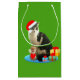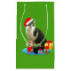Niedliche Geschenktasche mit einer Weihnachtskätzchen. Diese hübsche niedliche Katze Tabby Mackerel sitzt neben Engel und Geschenken