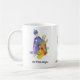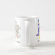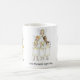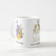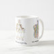 Eine weiße Tasse mit schwarzem Rand und Griff, mit drei Szenen aus einem Kinderkrippenspiel, von Designs, die von Judy Adamson in Aquarellen handbemalt wurden. Weihnachtskarten mit diesen Designs sind auch erhältlich