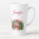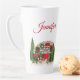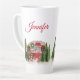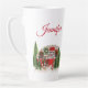 Eine verstorbene Tasse mit einem niedlichen und skurrilen Weihnachtsthema. Ein gemütlicher Wohnwagen, der zum Weihnachtsfest unter einigen Kiefern verziert ist. Personalisieren Sie Ihre Daten mit einem Namen oder einem anderen Text.
