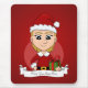 Design mit einer Illustration eines niedlich lächelnden glücklichen Mädchens mit kurz blonden Haaren, trägt sie ein rot-weißes Weihnachtskostüm und hält ein Geschenk; mit bearbeitbarem Textbogen für Ihren Namen oder Ihre Botschaft, Weihnachtsfeiertagsdesign mit rotem Hintergrund,