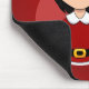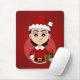 Design mit einer Illustration eines niedlich lächelnden, glücklichen Mädchens mit kurzem schwarzem Haar, trägt sie ein rot-weißes Weihnachtskostüm und hält ein Geschenk; Weihnachtsfeierdesign mit rotem Hintergrund