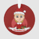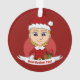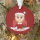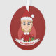 Weihnachtsschmuck mit einer Illustration eines niedlich lächelnden, glücklichen Mädchens mit kurzem blondem Haar, trägt sie ein rot-weißes Weihnachtskostüm und hält ein Geschenk; mit bearbeitbarem Textvorlage für Ihren Namen oder Ihre Nachricht, Weihnachtsfeiertage mit rotem Hintergrund