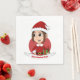 Napkins mit einer Illustration eines niedlich lächelnden, glücklichen Mädchens mit langbraunem Haar trägt sie ein rot-weißes Weihnachtskostüm und hält ein Geschenk; mit bearbeitbarem Textbogen für Ihren Namen oder Ihre Nachricht, Weihnachtsfeiertagsdesign mit rotem Hintergrund