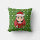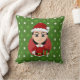 Design mit einer Illustration eines niedlich lächelnden, glücklichen Mädchens mit kurzem schwarzem Haar, trägt sie ein rot-weißes Weihnachtskostüm und hält ein Geschenk; Weihnachtsfeierdesign mit einem nahtlosen grünen Hintergrund mit Sternen