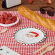 Schöner Weihnachtsmann auf weißem Papierteller. Text Frohe Weihnachten kann personalisiert sein.