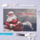 Der Weihnachtsmann hält einen Angelpol und fischt von seinem kleinen Holzboot aus. Ein Fisch sprang aus, um ihn zu sehen, als zu sagen "Frohe Weihnachten". Whimsisches Urlaubdesign.