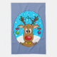 Niedliche, lustige, braune Rentiere mit einer leuchtend glänzenden Nase. Er trägt eine Krawatte aus gelbem Bogen um den Hals und hat von seinen Ohren hängende Bausteine. In seinen braunen Geweih verstrickt sind helle, glänzende Weihnachtslichter. Hinter ihm liegt ein Wintertag mit weißer Schneeflocke, die auf den schneebedeckten Boden fällt.