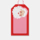 Dieses Geschenketikett zeigt eine Vintage Darstellung eines fröhlichen Weihnachtsmanns mit einem rosa Set aus der Weihnachtsmannmütze vor einem festlich roten Hintergrund.